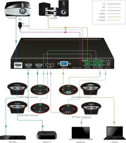 קופסת מיתוג מקצועית משולבת סקיילר 4K, שמאפשרת מיתוג אוטומטי בין 4 כניסות: 2xHDMI + VGA+AUDIO + DISPLAYPORT ליציאה אחת של HDMI. המיתוג מבוסס על זיהוי אוטמטי של הכניסה הפעילה, פונקצייה שהופכת את המוצר לאידיאלי לחדרי ישיבות – לחיבור מחשבים אורחים ללא צורך להתעסק במיתוג ידני. כמו כן, ניתן להתקין את המוצר בשילוב עם קופסאות שקעים שולחניות עם חיבורי מולטימדיה.